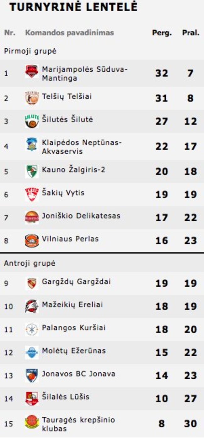 Paskutinę vietą užėmė Tauragės krepšinio klubas (8-30).