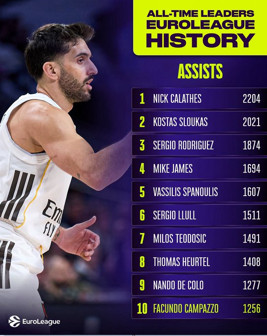 Argentinietis rungtynėse su Atėnų „Panathinaikos“ atliko 5 rezultatyvius perdavimus ir pakilo į dešimtuką Eurolygoje pagal rezultatyvius perdavimus.