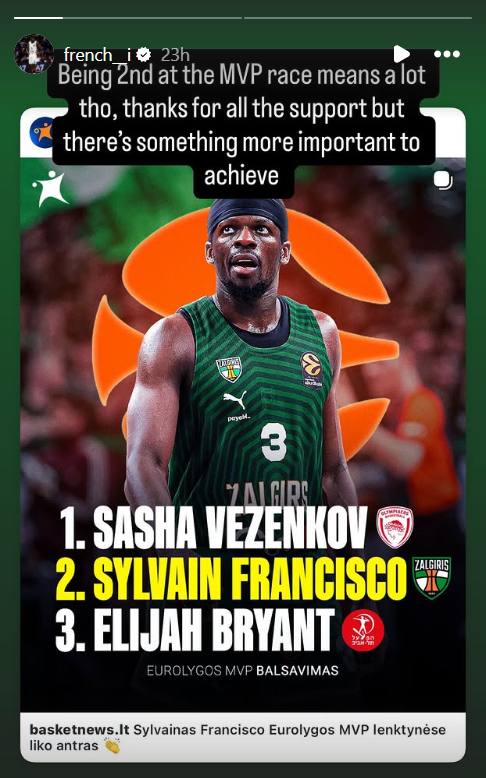 Kauno „Žalgirio“ gynėjas Sylvainas Francisco sureagavo į tai, kad liko per žingsnį nuo Eurolygos MVP apdovanojimo. Krepšininkas pripažino, jog toks rezultatas yra šiek tiek nuviliantis, tačiau kartu pabrėžė, kad didžiuojasi savo sezonu ir komandos pasirodymu.