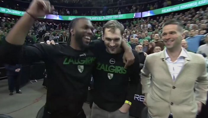 Krepšininkas prisijungė prie „Žalgirio“ fanų skanduočių ir apsikabinęs Tylerį Cavanaugh pradėjo šokinėti.