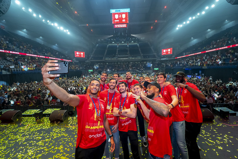 Skelbiama, jog net 7 tūkst. gerbėjų susirinko Madride į „WiZink“ areną pasveikinti naujųjų Europos čempionų.
