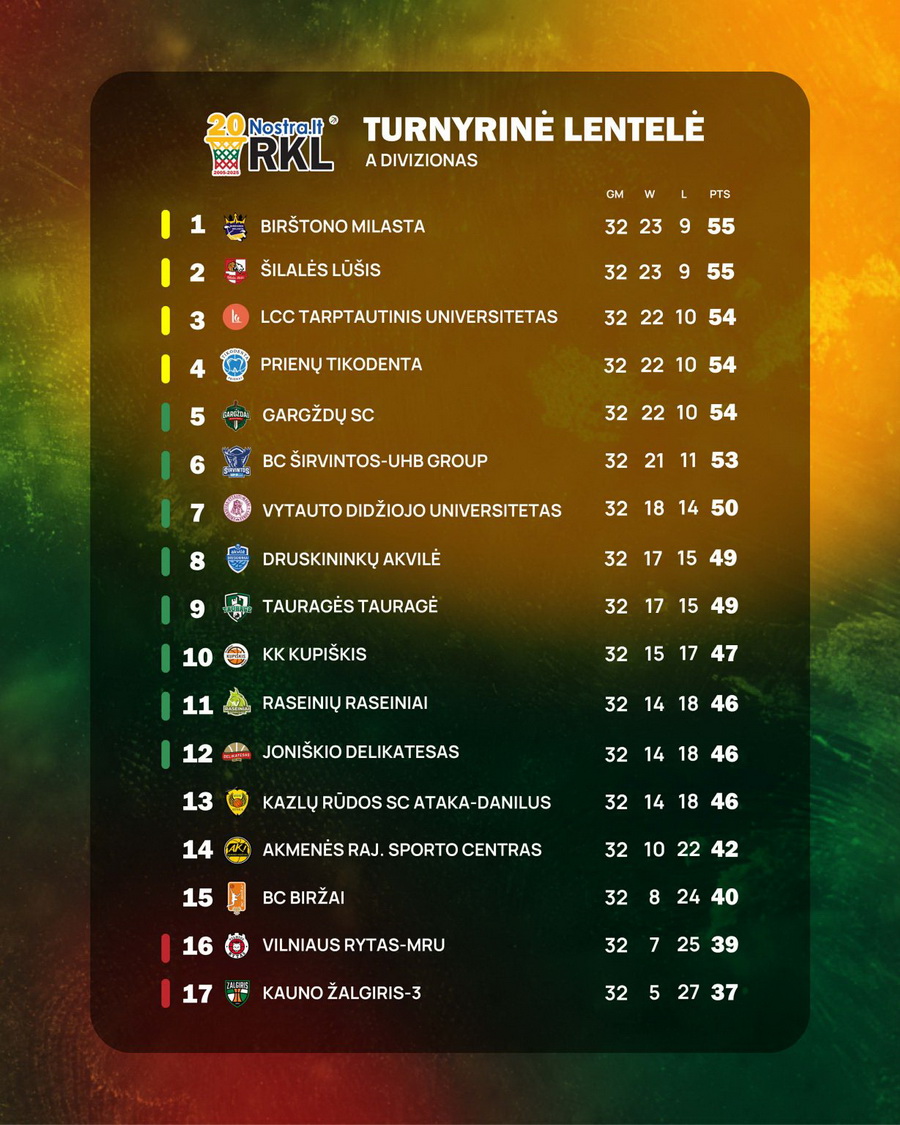 Nostra.lt-RKL A divizione baigėsi reguliarusis sezonas, o dabar prasideda viena įdomiausių čempionato dalių – atkrintamosios. Po 32 rungtynių maratono komandos išsidėliojo galutinėse turnyrinės lentelės pozicijose, kurios nulėmė ne tik aštuntfinalio poras, bet ir visą tolimesnį kelią link sezono finišo. Kova dėl vietos tarp stipriausiųjų įgauna dar didesnę svarbą, nes nuo šio etapo kiekviena klaida gali kainuoti visą sezoną.
