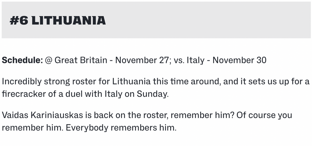 „Į Lietuvos rinktinę grįžta Vaidas Kariniauskas. Ar pamenate jį? Žinoma, kad pamenate. Visi jį prisimena“, – pareiškė FIBA.