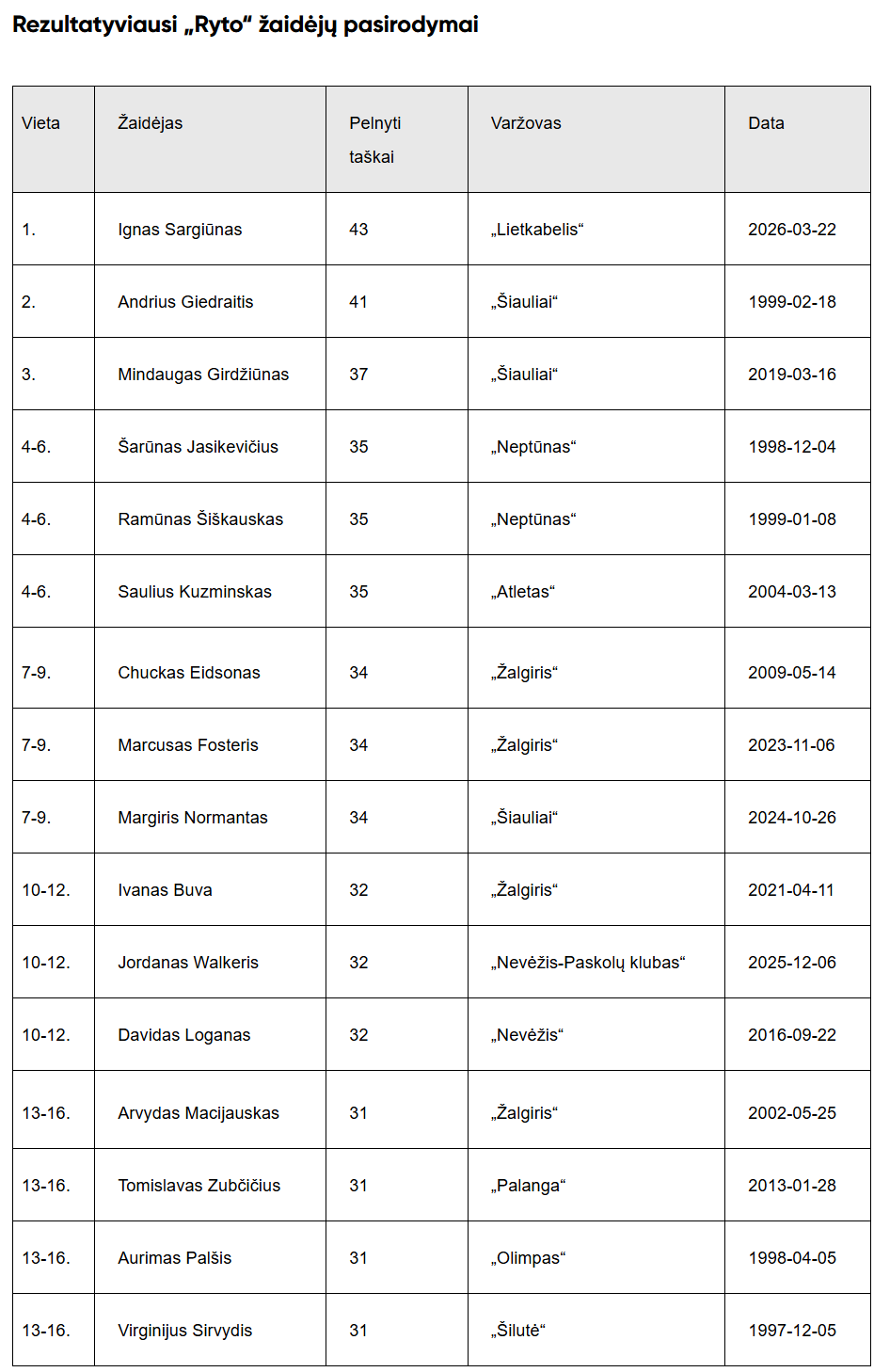 Iš sąrašo matyti, kad „Ryto“ žaidėjams itin gerai sekasi pelnyti taškus prieš amžiną varžovą „Žalgirį“.